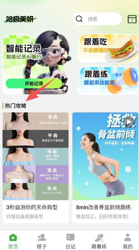 1、设智能记录功能,配备跟着吃跟着练板块,含热门肩型攻略,覆盖多类形体管理相关内容。
