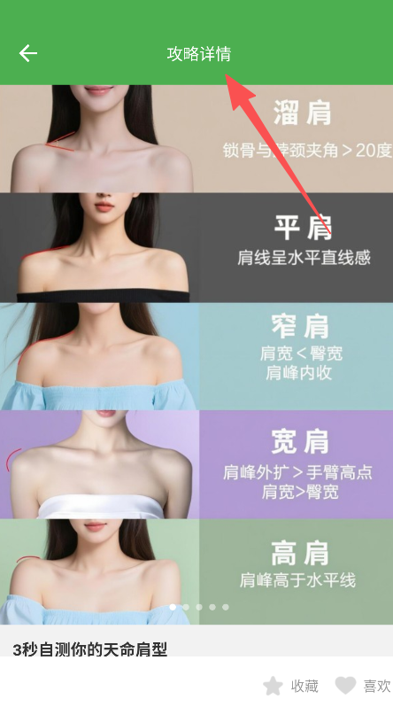 2、展示热门肩型攻略,查看攻略详情,了解不同肩型的特点及对应的建议内容。