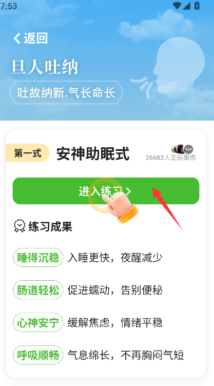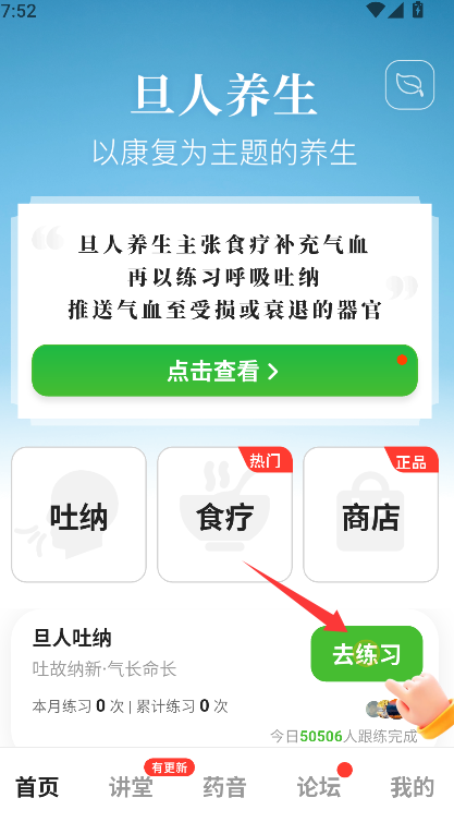 1、找到“旦人吐纳”功能板块,点击其右侧明确标注的“去练习”按钮,随后页面将跳转至旦人吐纳功法的主介绍与选择界面。