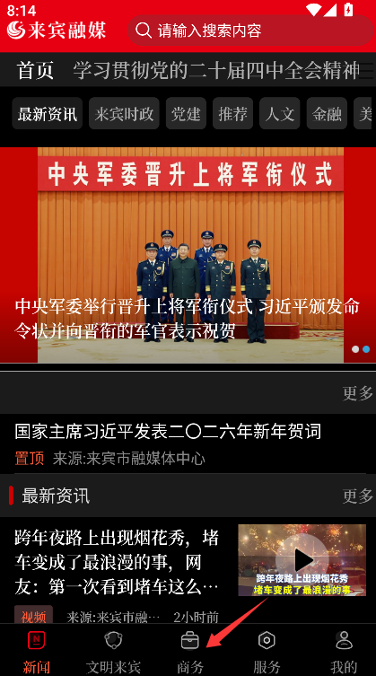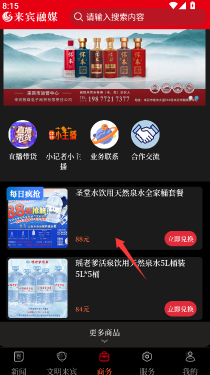 1、找到并点击底部导航栏或功能区的“商务”分类入口,进入商务服务与兑换中心界面。