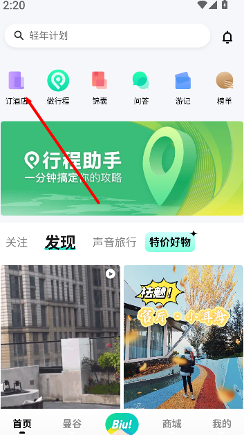 1、打开《穷游》APP进入首页,在功能菜单中找到 “订酒店” 入口,点击即可进入酒店预订专属页面。