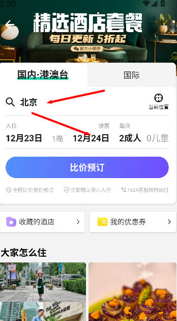 2、在预订页面输入目标入住城市,选择明确的入住及退房日期,确认后提交筛选条件。