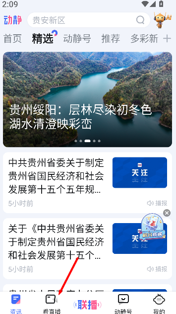 1、打开《动静新闻》软件,在首页找到 “直播” 栏目入口并点击,即可进入直播专区观看正在播出的内容。