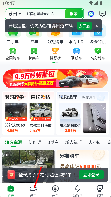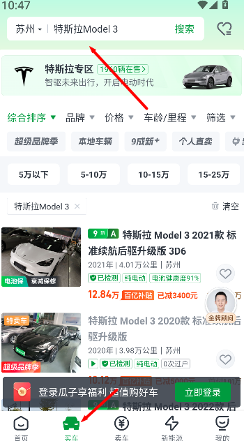 1、打开瓜子二手车软件,在首页找到 “买车” 相关入口,点击进入即可进入专属购车板块,浏览海量车源信息。