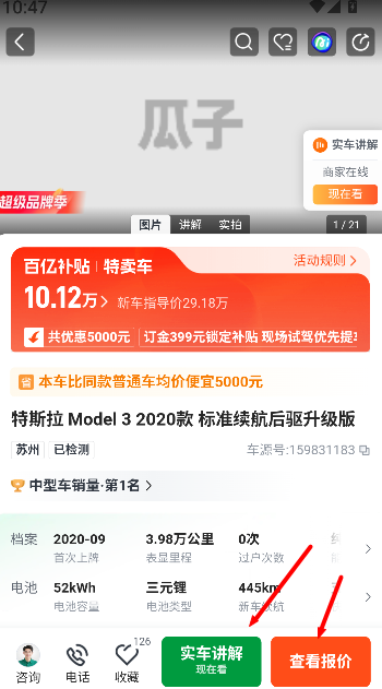 3、点击目标车型查看具体报价及车况详情,随后找到实车讲解入口,观看一对一视频讲解了解车辆细节。