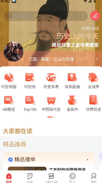 1、打开《全历史》软件进入首页,在时空地图、关系图谱等核心板块中选择感兴趣的内容,开启历史世界探索之旅。