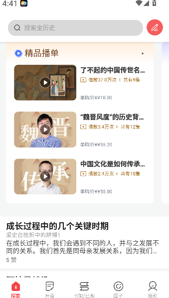 2、在首页或底部导航栏找到 “音频” 相关入口,点击进入后浏览历史讲解、文化解读等分类的精品播单,选择后即可播放收听。