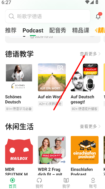 2、在 Podcast 页面浏览热门推荐内容后,找到 “查看更多” 按钮并点击,解锁完整播客列表与分类。