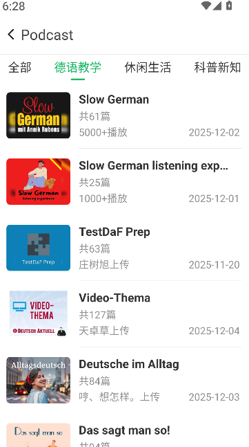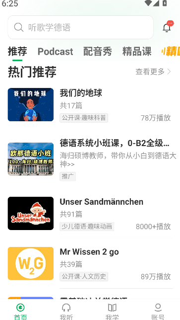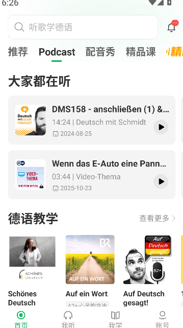 1、打开《每日德语听力》软件,在首页或功能菜单栏中找到 Podcast 栏目图标,点击进入播客专属页面。