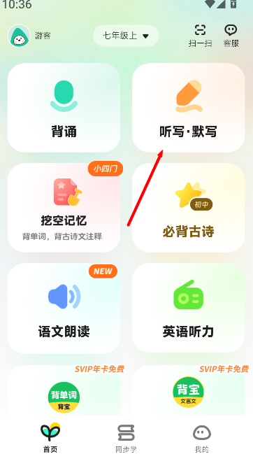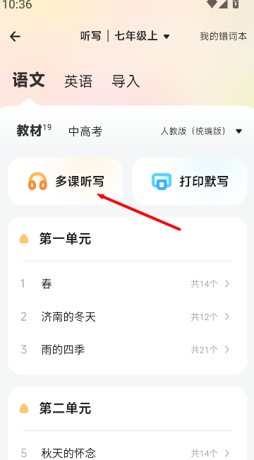 1、在软件对应学科界面找到听写功能入口点击进入,选定需默写的内容后,跟随标准语音播报完成书写练习。