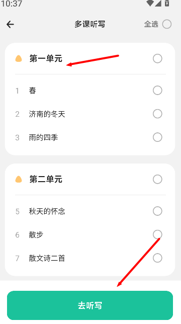 3、选择对应教材版本与年级,定位至第一单元,选定该单元生字词或单词,启动听写功能开始练习。